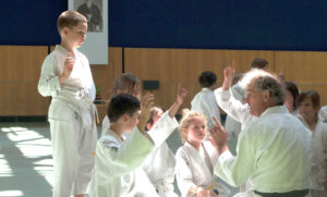 l bambini hanno un livello di entusiasmo molto più alto, più autentico e genuino rispetto agli adulti. Il loro spontaneo approccio ci ha permesso di creare nuove strade per l’arte meditativa dell’Aikido. Per questo allenarsi con i bambini è un’esperienza molto bella e gradevole. Quando ci sono 20-30 bambini nel dojo, si crea un’atmosfera carica di un’indescrivibile energia. La stagnazione della nostra arte negli ultimi 20 anni ha portato all’innalzamento dell’età media dei praticanti. L’allenamento fisico, l’intensità del movimento, la resistenza e le prestazioni acrobatiche dell’ukemi sono spesso state adattate per questa non più giovane fascia d’età. Con bambini ed adolescenti vale esattamente l’opposto: la pratica è molto più energica che per gli adulti. Spetta a noi insegnanti creare un’atmosfera di gioia per ogni livello, ricordando che questa è una grande opportunità di sviluppo.