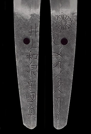 Nella immagine: il crisantemo imperiale (kikumon) impresso sul codolo (nakago) di un lama di epoca shinto opera di Inoue Shinkai.