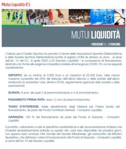 L’intervento presso la dirigenza dell’Istituto per il Credito Sportivo, consistente nel formulare proposte per una alternativa alla produzione del bilancio 2019, alla fine dovrebbe prevalere sugli schemi classici e preconfezionati degli Istituti di credito, facendo allineare la richiesta documentale dell’I.C.S. a quella medesima prevista per il credito agevolato alle imprese, sempre con la garanzia del Fondo Statale.