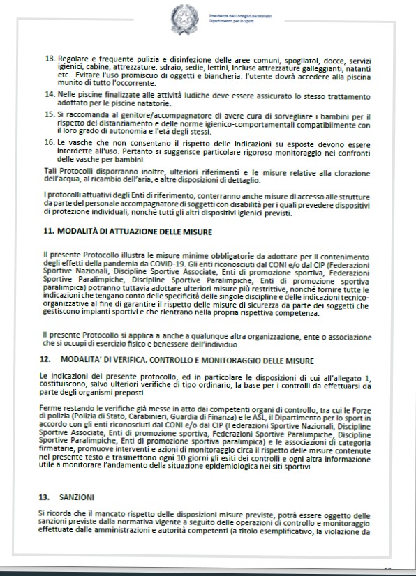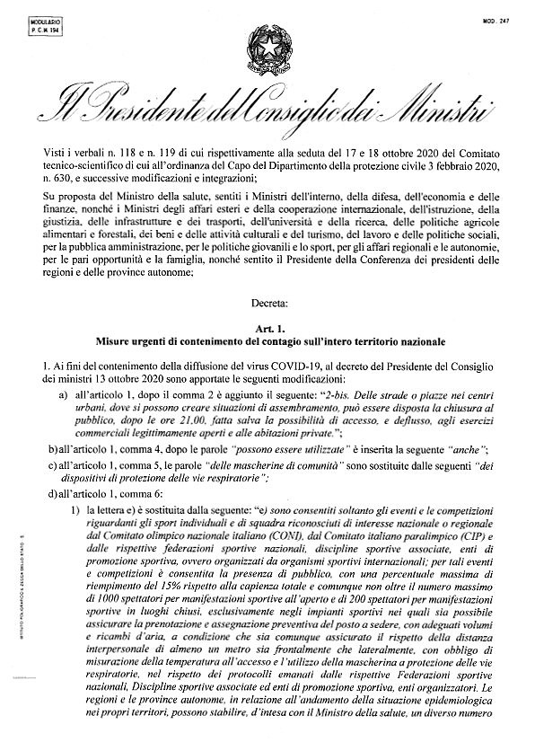 «Sono sospesi tutti gli eventi e le competizioni organizzati dagli Enti di promozione sportiva, mentre sono consentiti soltanto gli eventi e le competizioni di livello agonistico e riconosciuti di preminente interesse nazionale con provvedimento del CONI o del CIP [Comitato Italiano Paralimpico]»