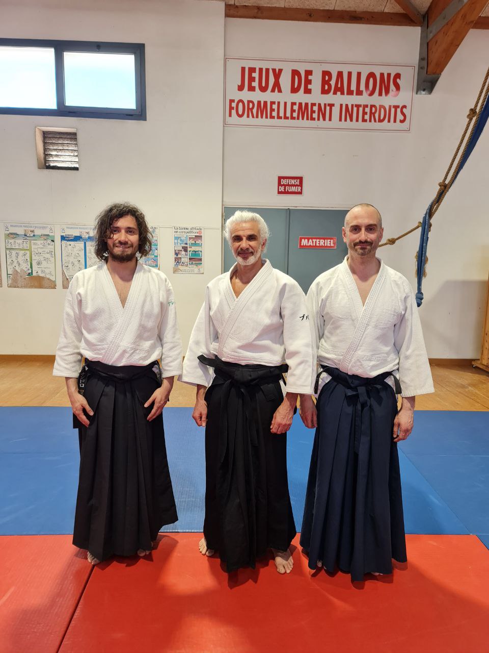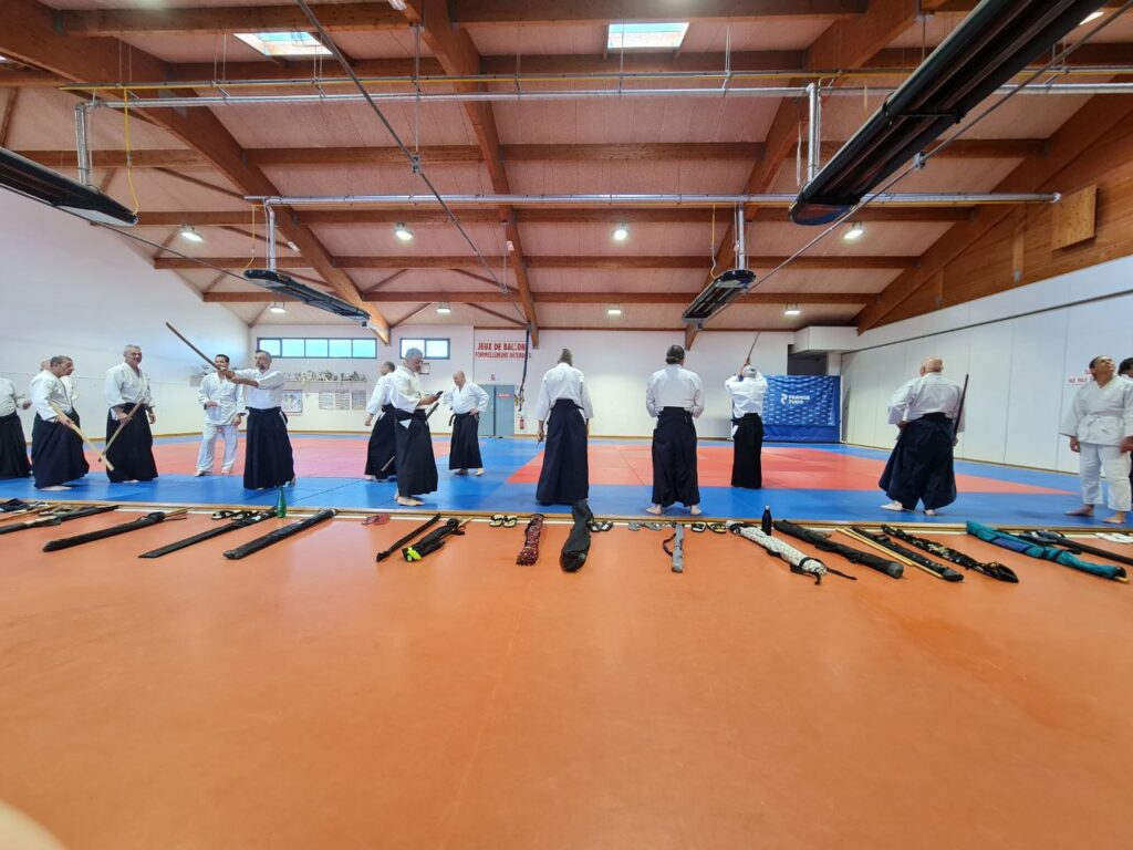 Pratico con Adrien Rocci, amico di tatami dallo stage di Roquebrune. Gli esercizi sui due aspetti citati sopra sono tanti e ci alterniamo praticando ad un buon ritmo. Dagli esercizi si passa poi ai kata di Aikiken applicando questi concetti.