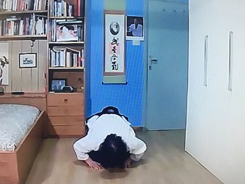 Tolgo la funzione video galleria e metto in evidenza la mia webcam, cercando di mostrare ogni passo, ogni posizione, ogni spostamento in modo che ognuno possa osservare bene e provare a riprodurre. Si ripete molte volte insieme, poi rimetto la galleria e guardo ogni partecipante, controllando ogni esecuzione, ed evidenziando le correzioni da fare. Ritorno in evidenza e spiego cosa e come correggere, ripetiamo ancora eseguendo le correzioni suggerite, poi torniamo in galleria dove ci vediamo tutti e cominciamo ad aumentare il ritmo. Do il via contando ed eseguiamo decine di volte la stessa tecnica da tori, aumentando la velocità e l’energia. Spesso suggerisco anche di immaginare questa esecuzione a contatto con il proprio uke, scelto nel gruppo.