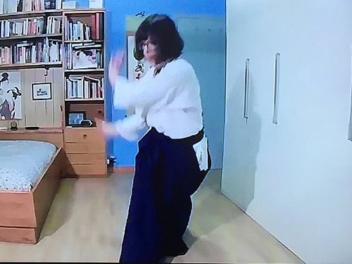 Mi sono vestita con keikogi e hakama, ho messo la foto di o sensei e sono partita come se fossimo insieme nel nostro dojo. Dopo l’aiki taiso, iniziamo a muoverci con irimi tenkan e tenkan, movimenti spontanei per tutti, che ci fanno entrare automaticamente nel normale allenamento. Dopo qualche minuto inizio a lavorare su dei taisabaki che saranno i movimenti delle tecniche che sto per proporre. Iniziamo dallo spostamento dei piedi e delle gambe e poi aggiungiamo anche il movimento delle braccia: quando riusciamo a muoverci bene, passiamo alla tecnica, da tori.