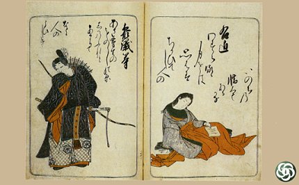 La stampa di Karsukawa Shunsho (1775 circa) rappresenta il guerriero e poeta Sangi Hitoshi, figura semileggendaria del X secolo, intento a esprimere la sua ammirazione alla cortigiana Ukon.